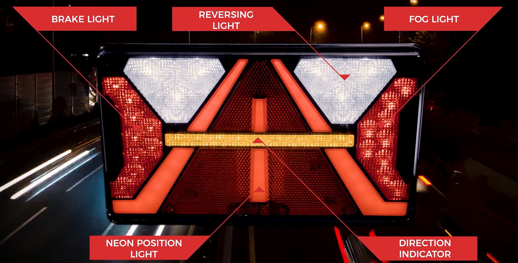 Notre dernier modèle de lampe arrière multifonction STRADA LZD 2821 (droite) appartient au groupe de produits HOR 124. Il comporte 71 LED et nécessite une tension d’alimentation universelle de 12/24V. Cette lampe dispose de toutes les fonctions d’éclairage indispensables que l’on trouve à l’arrière des véhicules de livraison, ainsi que sur les remorques, les caravanes et les remorques agricoles. La lampe multifonction comprend : un feu de position arrière NEON (2,2/5,5 W), un feu stop (2,8/3,6 W), un feu de recul (2,2/6,4 W), un feu antibrouillard (4,8/5,5 W), un clignotant arrière (1,7/2,4 W), l’éclairage de la plaque d’immatriculation (0,5/1,2 W) ainsi que le triangle réfléchissant.